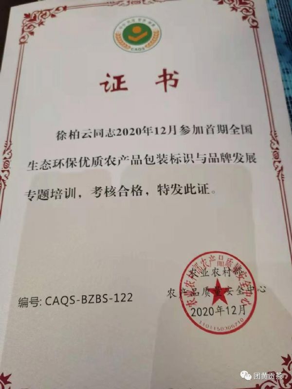 在首期全國生態(tài)環(huán)保優(yōu)質(zhì)農(nóng)產(chǎn)品包裝標(biāo)識與品牌發(fā)展專題培訓(xùn)班上,湖北團(tuán)黃貢茶有限公司董事長徐柏云登上了頒獎舞臺,親手接到了農(nóng)業(yè)農(nóng)村部農(nóng)產(chǎn)品質(zhì)量安全中心領(lǐng)導(dǎo)頒發(fā)的證書;并在培訓(xùn)結(jié)束時,順利完成全國生態(tài)環(huán)保優(yōu)質(zhì)農(nóng)產(chǎn)品包裝標(biāo)識與品牌發(fā)展專題培訓(xùn)結(jié)業(yè)考核。