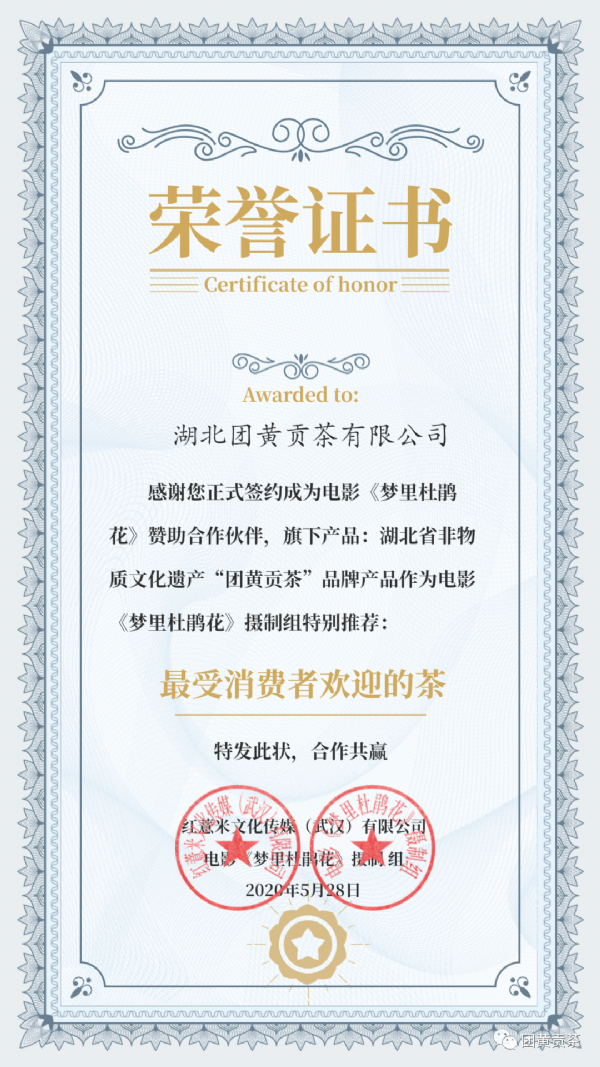 電影《夢里杜鵑花》日前正式與湖北團(tuán)黃貢茶有限公司成功簽約成為贊助合作伙伴:"團(tuán)黃貢茶"正式成為電影《夢里杜鵑花》特別推薦:最受消費(fèi)者歡迎的茶。